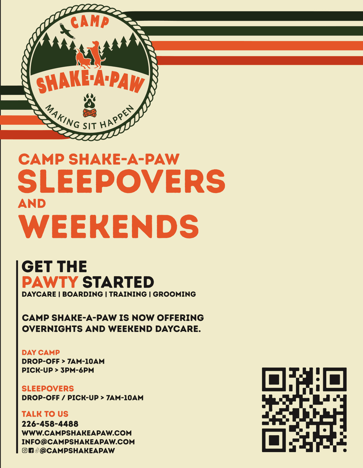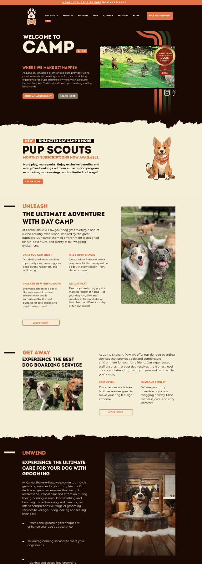 Brand Manager for Camp Shake-A-Paw, responsible for the full brand across digital and print. I designed and managed the website, created all photography and videography, and produced marketing content for social media and ads. I developed the brand identity, visuals, messaging, and campaigns to increase awareness and grow engagement. My work included strategic planning, content creation, editing, design, and advertising. The result was a consistent, recognizable brand with strong customer connection.